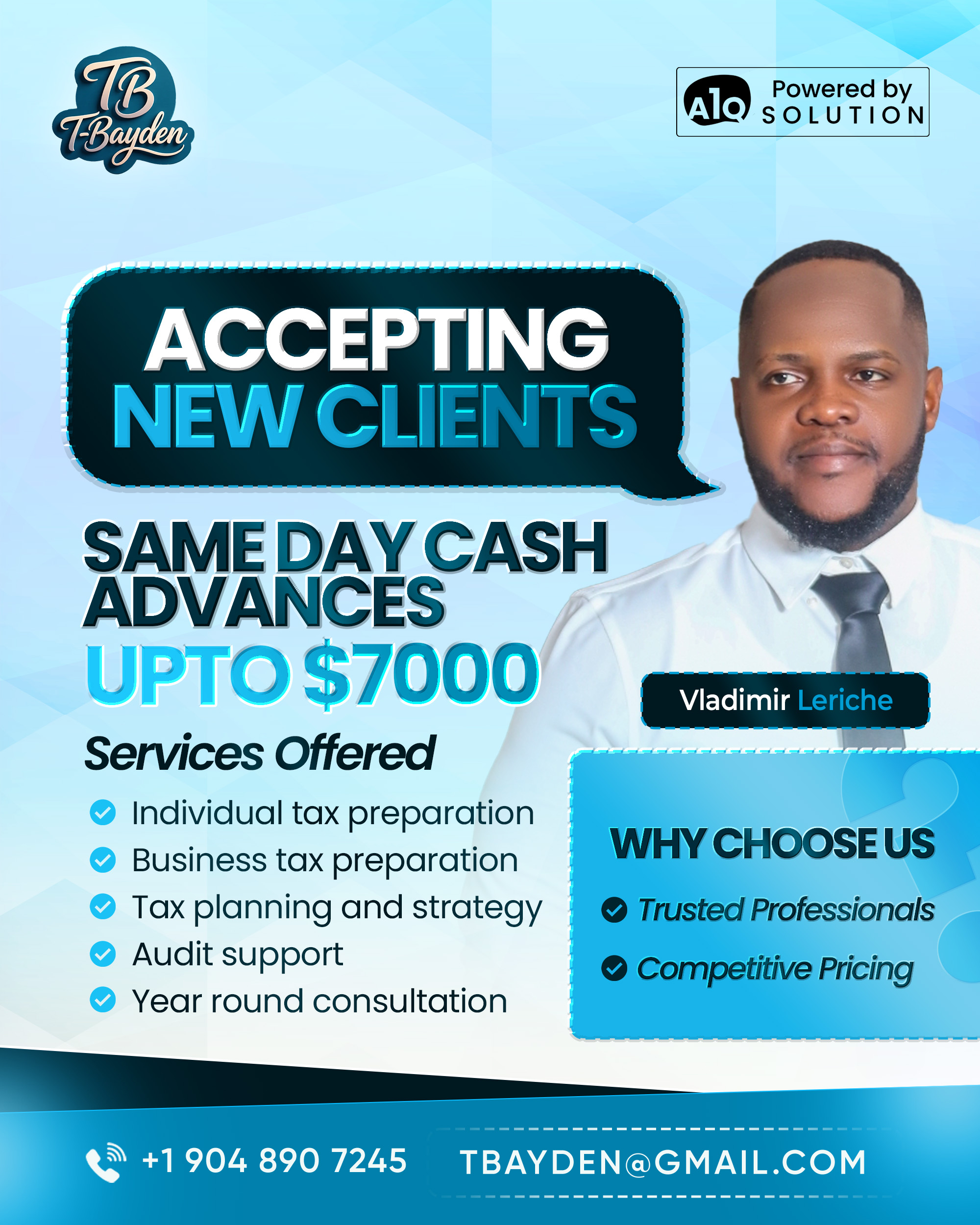 Thank you for choosing T-BAYDEN LLC for your tax filing needs! We’re excited to serve you. Please complete the intake form as thoroughly as possible. If you have any questions or need assistance, feel free to email us at [email protected] or call +1 904 8907 245.